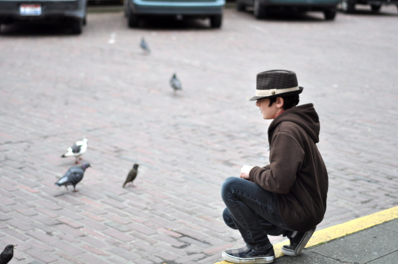Walking outside Pike’s place, came across the boy feeding grains to the really fat pigeons. 50mm prime did the work for me.