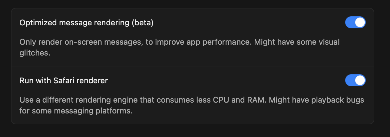 The "Run with Safari renderer" is something new and also touts CPU and RAM improvements compared to the chromium renderer.