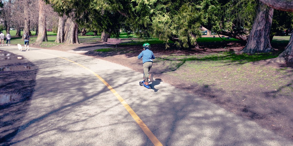 The 3.0 mile track is flat and allows O to follow us along in our walks while H and O continue their Pokemon Go! journey.